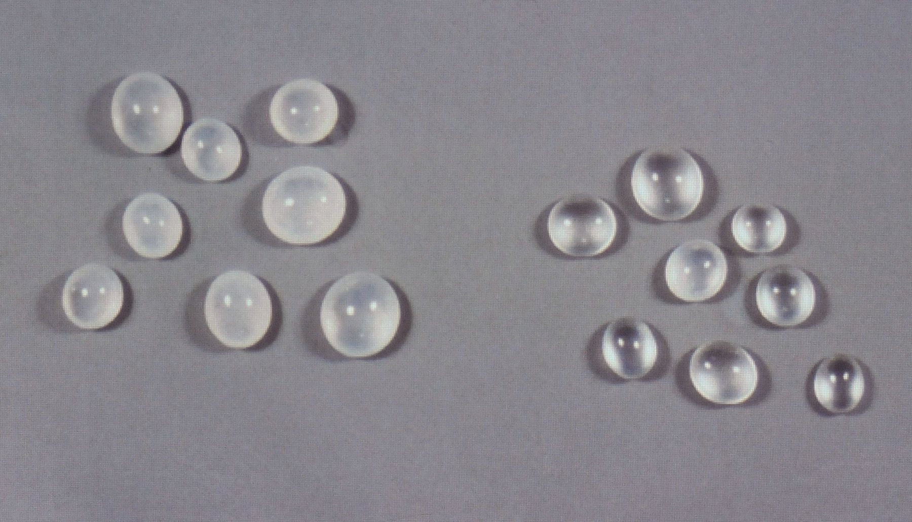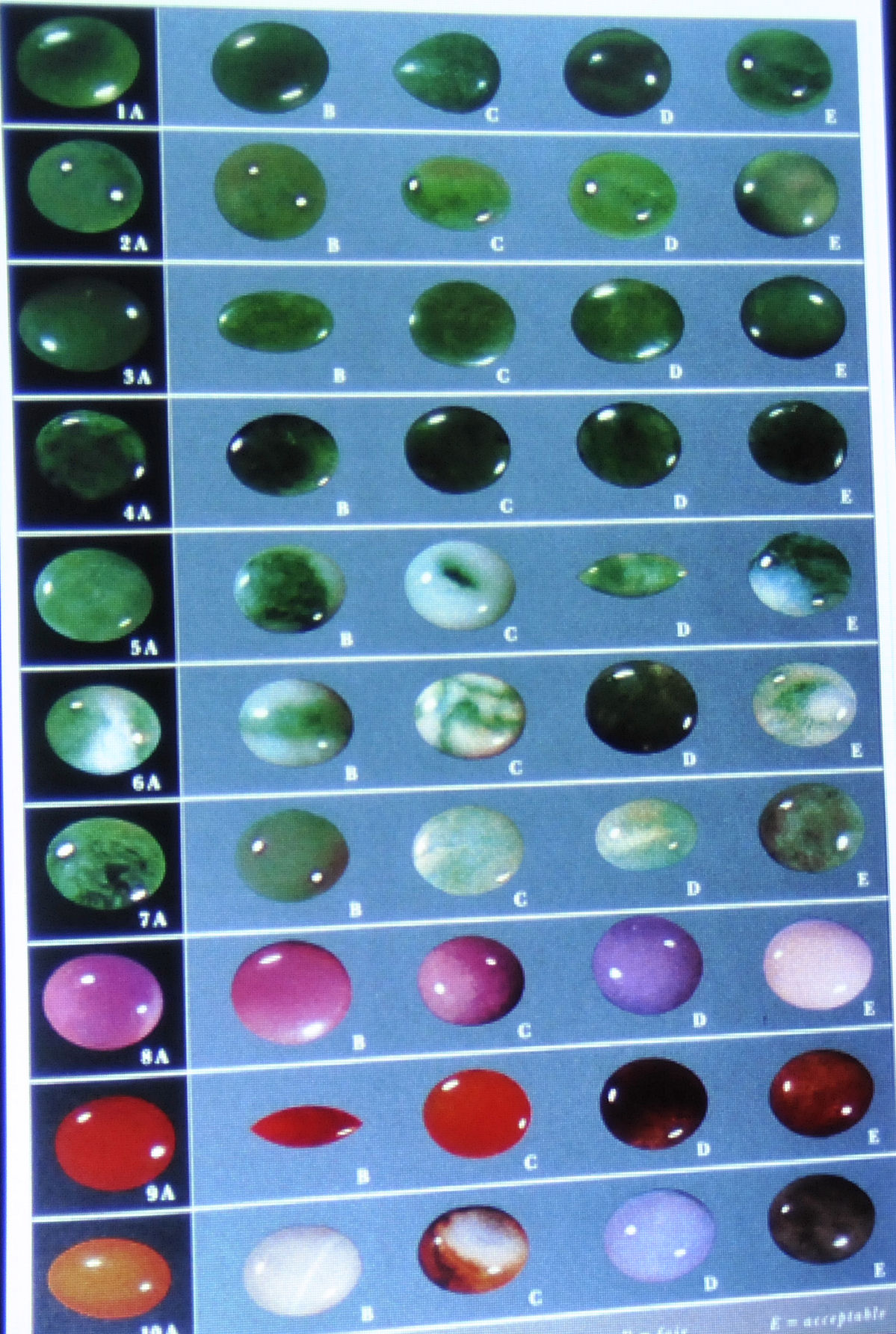 The finest material is dedicated to cabochons. The ideal proportions for a cabochon are 1x2x3 (depth, width, length), and preferably a double cabochon as well. An orange rind texture is typical for jadeite jade polish, though cutters are now able to achieve a mirror polish using diamond dust.