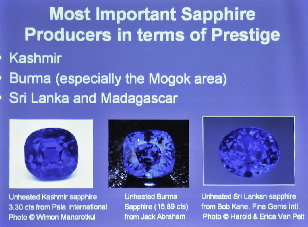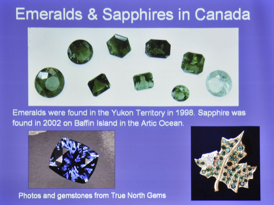She started the lecture with a discussion of new geographic sources for rubies, sapphires, and emeralds, citing especially Greenland (rubies), Baffin Island (sapphires), Madagascar (for all stones) and northern Canada (emeralds) as new sites. She then discussed treatments, citing introduction of borax flux to fill cracks (especially emeralds) beginning in the 1990s, use of irradiation to enhance or change colors of sapphires (after 2000), oiling and/or dying of rubies to improve their color, and lead glass filling of rubies (1990s onward).