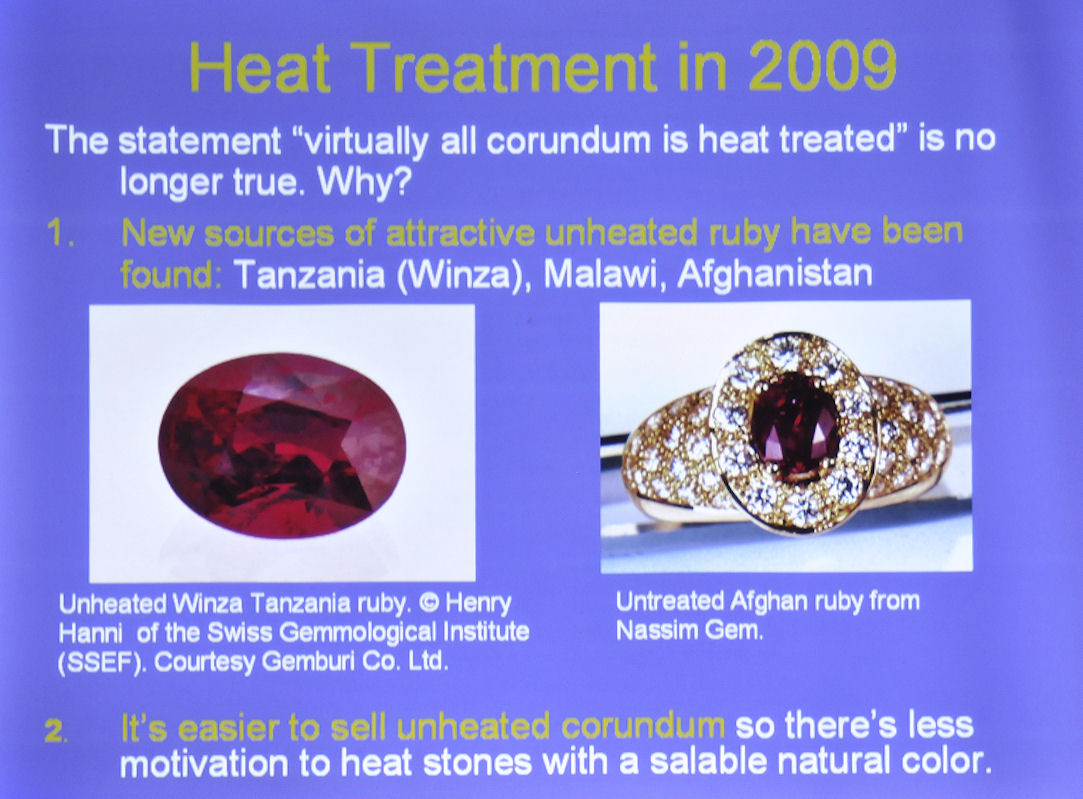 She described several new treatments that strengthen color or curtail brittleness. Almost one hundred per cent of stones today are at least heat treated to improve or change color, she reported.