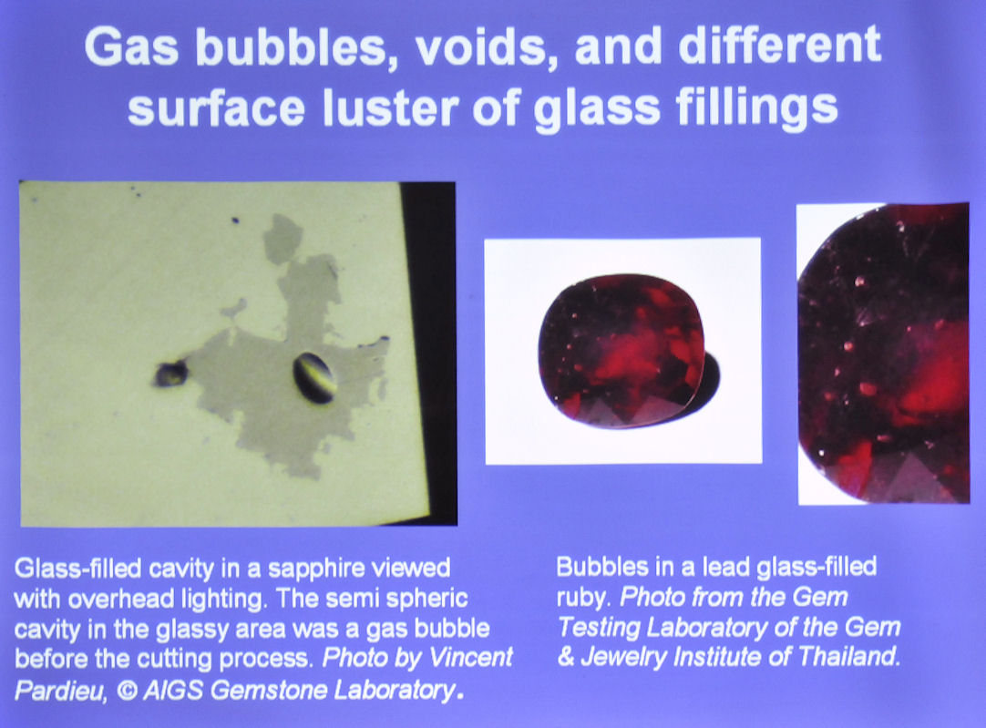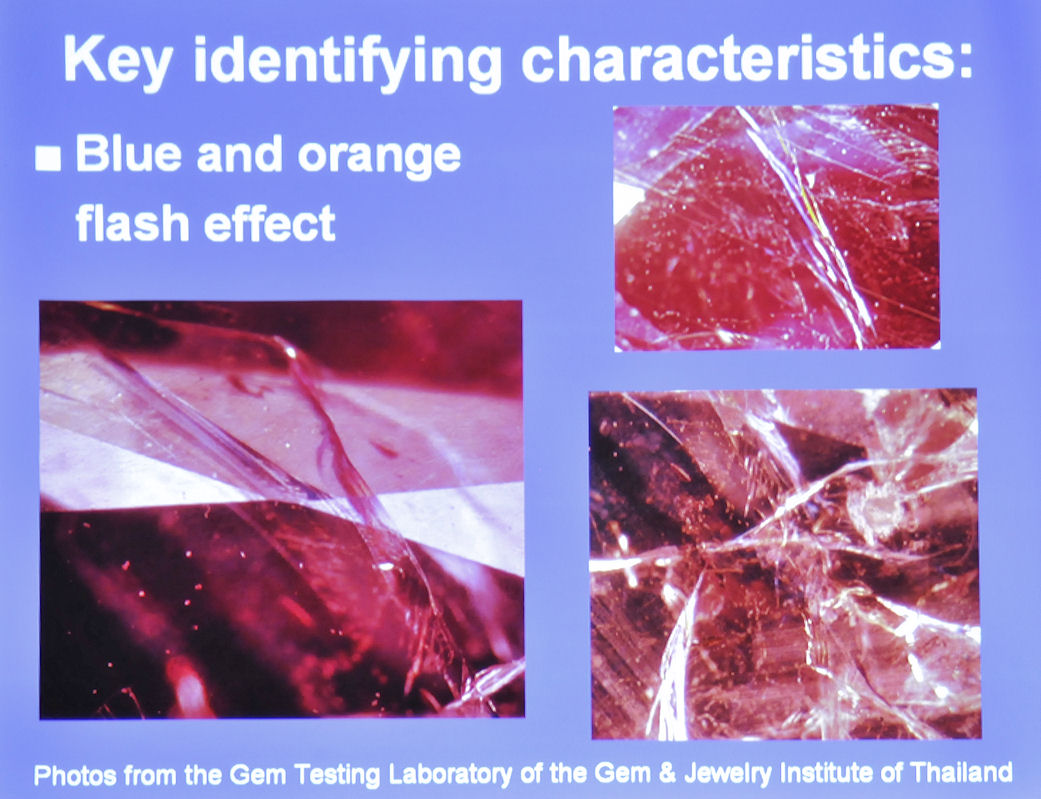 The use of lead glass fillings, she noted, transforms poor quality rubies into very good quality ones, but the filling does not last. The Federal and many state governments, she said, do not want lead in any substances, so ruby or emerald suppliers will be even more reluctant to disclose such treatment. She warned that one should be wary of a dealer selling large rubies at low prices; they are probably lead-glass filled. Another signal that a ruby might be lead-glass filled is the word “composite”, the word now used to describe lead-glass filled ruby. Another new, important type of treatment, lattice diffusion, she emphasized, changes stones’ colors by diffusing coloring ions into the stone through heat. Heavy ions like titanium or chromium do not go deeply into the stone because of their atomic weight, while lighter ions like beryllium will diffuse deeply into the stone.