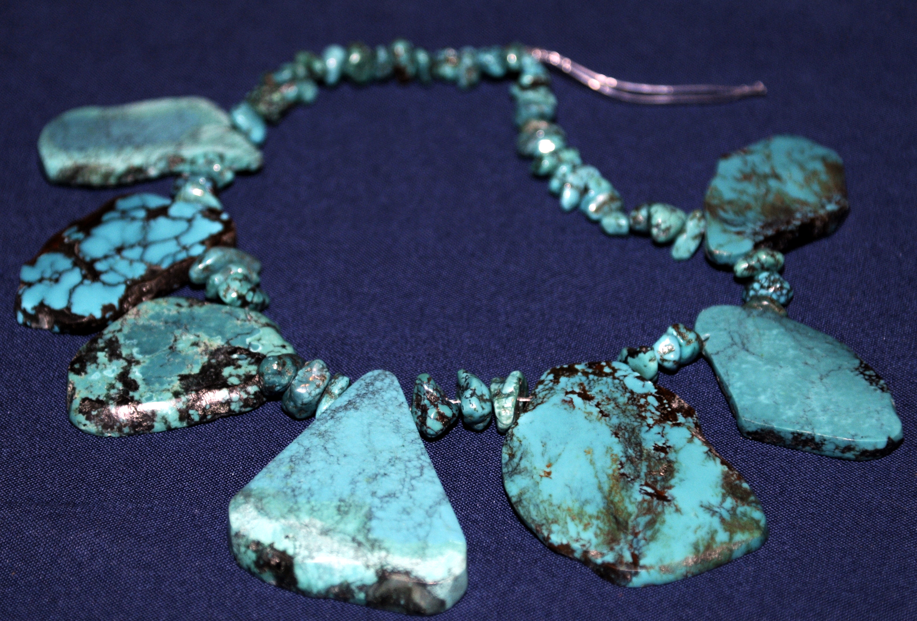 Turquoise necklace purchased in Tucson 2012 Hubei Province of china called Zhu Shau Turquoise. Like old Arizona spider web variety once considered the best. Note turquoise fills dissolved pyrite in copper deposits.