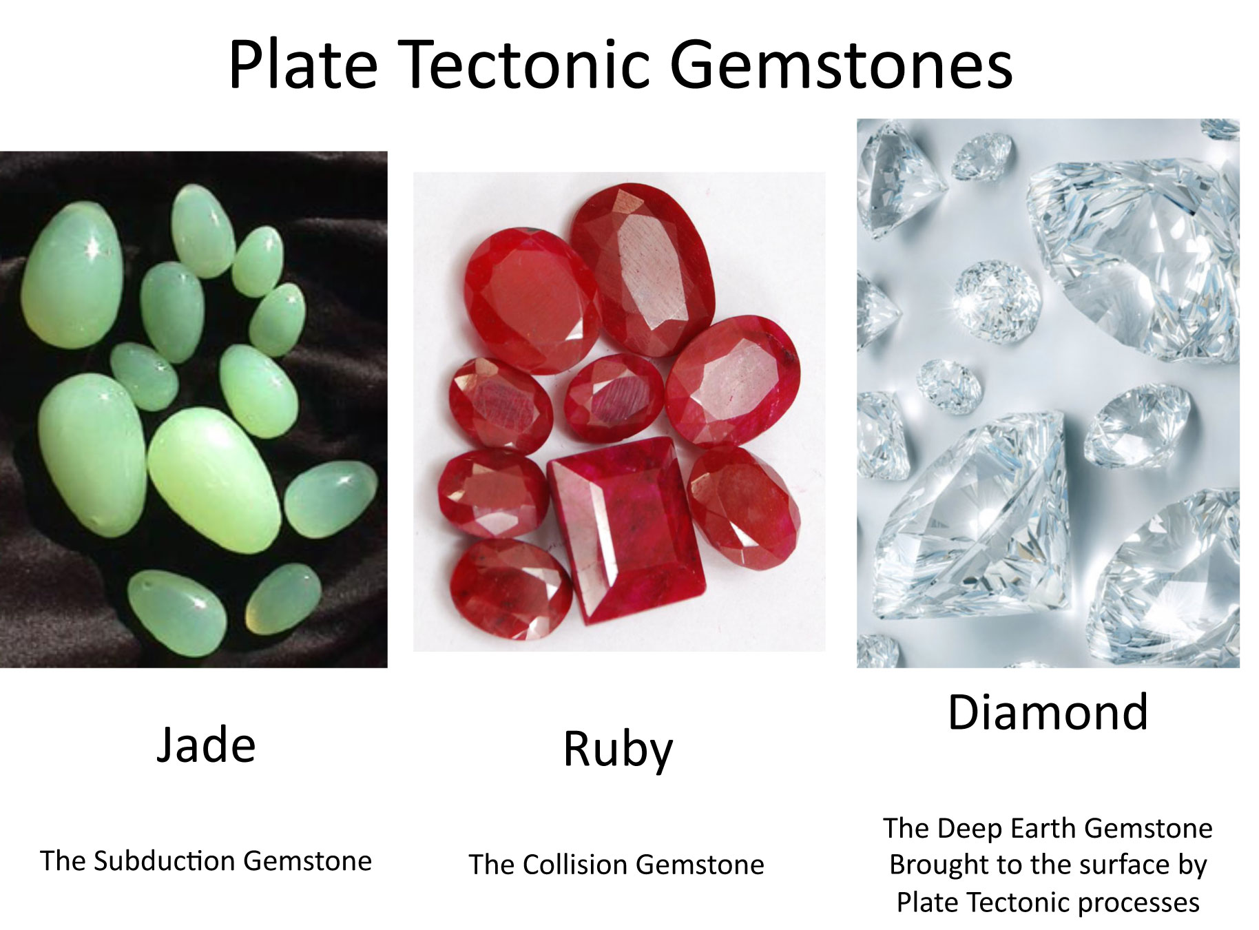 As you can expect many things happen deep in the Earth but certain gemstones are only found in certain environments and can be used to identify the Plate Tectonic environments in which they form. Understanding these tectonic environments helps gemologists understand these gemstones and the location of diagnostic gemstones helps geoscientists understand Plate Tectonics.