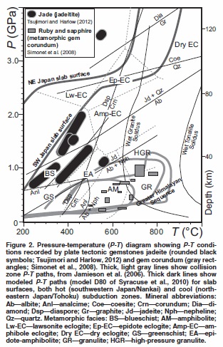 Jadeite forms in the subduction zones, where the seafloor and the underlying oceanic