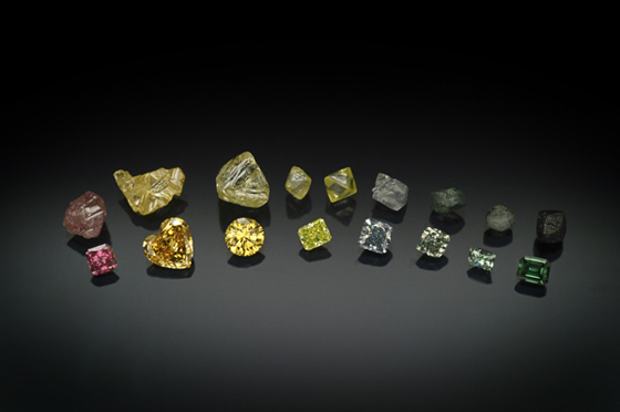 Colored diamonds are often best viewed in comparison with something that contrasts with what you want to see, not with something similar. In the case of colored diamonds, rough often does not show the color that cutting will yield. Looking at the picture of Colored Diamonds Rough & Polished, the Blue Diamond fifth from the right, shows almost a colorless rough from which a similar blue color might come once cut.