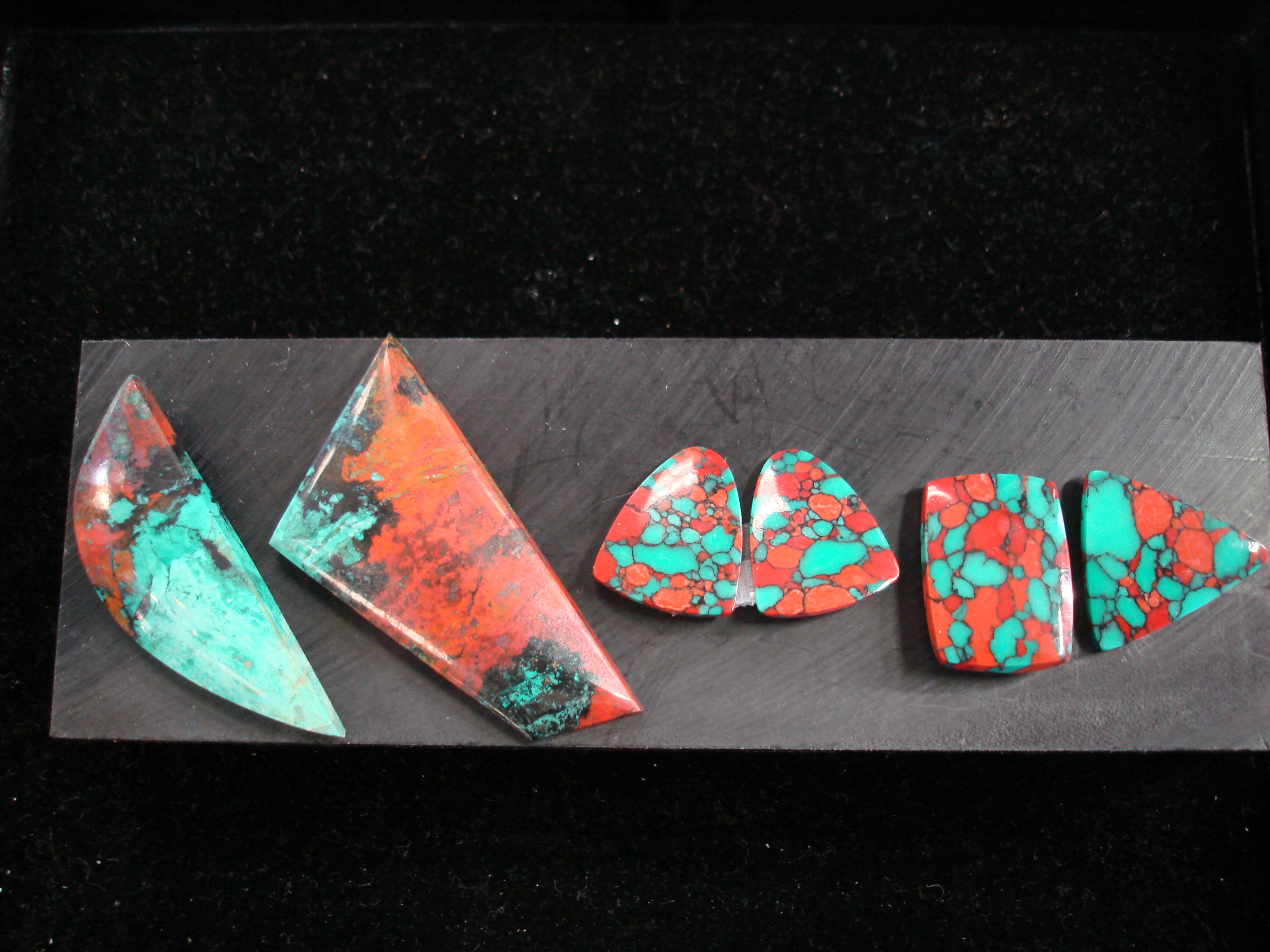 Natural Sonora chrysocolla (left x2) beside Simulant (right x2)